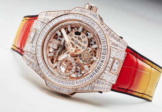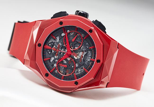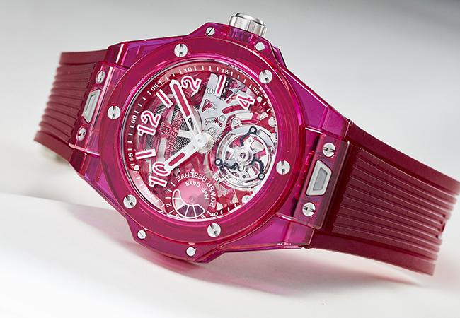 內裝品牌新一代的HUB6016 陀飛輪機芯,動力儲存達五日。換上紅色藍寶石水晶錶殼,機芯夾板也加入同樣色系,帶來了新的豔麗感。45mm/紅色陶瓷/參考價請電洽
