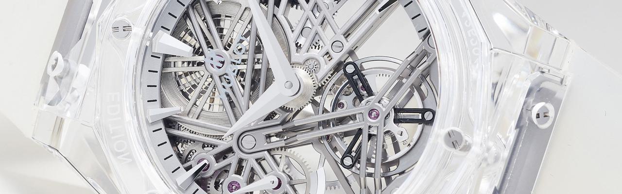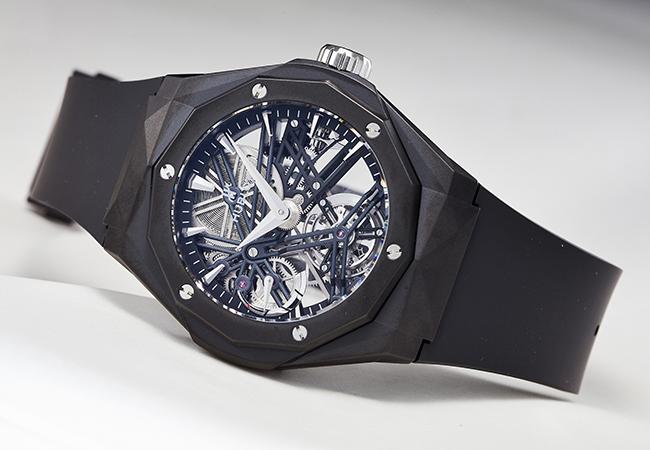 等於一年參加兩個錶展的HUBLOT宇舶表,在S.I.H.H.期間場外展出的作品,主要強調他們在材質上的見解。有色的藍寶石水晶、異色陶瓷,或加入碧璽等異材質,以此說明品牌設計的大膽與強大執行力。扛起這次複雜功能擔當的,則是Orlinski陀飛輪。