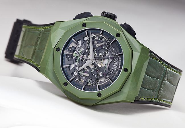 之前便發表過的作品,以墨西哥為靈感的特版版本,綠色的多切面陶瓷錶殼,充滿風格,也是品牌在材質上的革新。內裝HUB1155自動上鍊機芯。透明底蓋壓印墨西哥國旗蛇與鷹的圖騰。45mm/綠色陶瓷/參考價請電洽