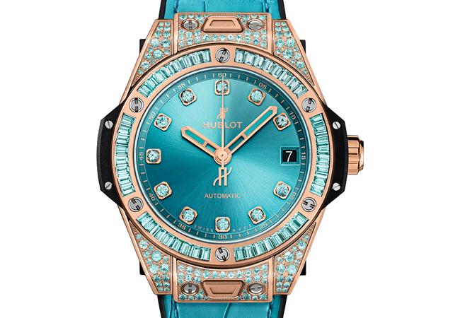 宇舶向來勇於嘗試各樣材質,這次首度將有碧璽之王之稱,一般用於高級訂製至寶的帕拉依巴碧璽(Paraiba Tourmalines)融入腕錶之中。分別以梯形切割與明亮切割鑲嵌於錶圈與錶殼上。品牌強調碧璽來自公平採礦產地,說明對於環境、社會的友善。45mm/白金/參考價請電洽