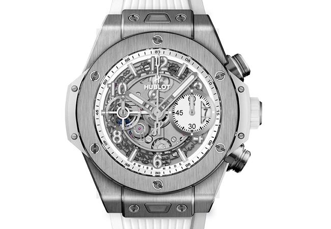 去年發表,裝配具備多項專利的第二代自製Unico機芯, 厚度、尺寸都向下微調的Big Bang Unico42,今年換上白色主題,讓整體風味更為中性。42mm/鈦金屬/參考價請電洽