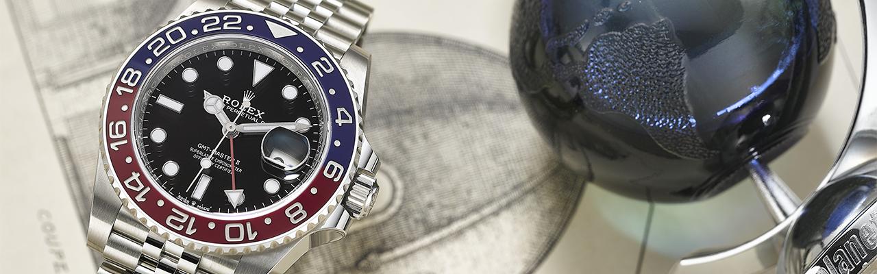 此時,美國著名的汎美航空公司,選擇勞力士的GMT Master為指定腕錶,以便機師掌握最正確的時間。當時首款GMT Master腕錶,便是採用紅藍雙色塑膠材質的24小時錶圈,為了提升材質的耐用度,於1959年改用紅藍雙色的氧化金屬鋁錶圈。因此,過去的GMT Master與GMT Master II所塑造的經典樣貌,自然脫離不了紅藍色錶圈。由於GMT Master的24小時指針是與小時指針連動,所以前往第二地時區時,設定時間較為麻煩,於是勞力士在1982年,推出可快調短時針的GMT Master IIRef.16760,自此GMT Master II成為勞力士最重要的兩地時間錶款。不過直到2000年之後(GMT Master Ref.16700於1999年停產),市面上所販售的不鏽鋼GMT Master II款式,以黑圈、紅黑圈為較為常見,紅藍圈款反而較少見。