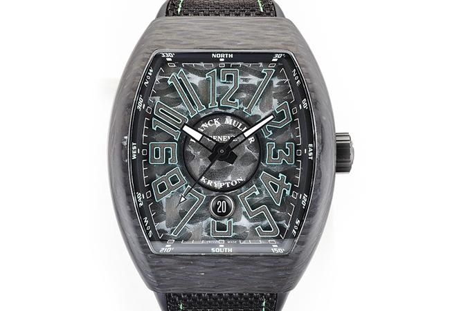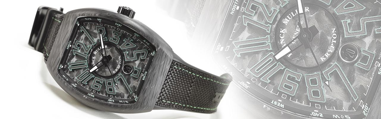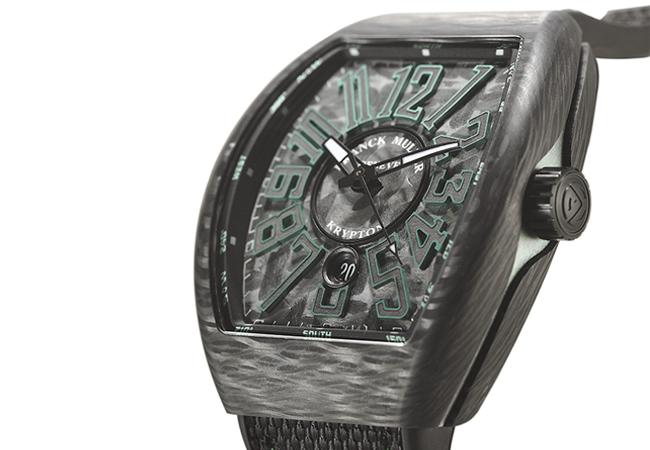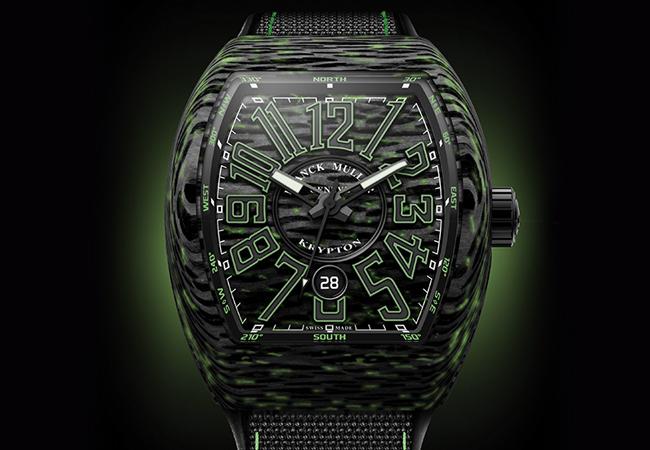 錶款名為Vanguard Carbon Krypton,稍微深究一下其實頗有趣味。Krypton不是個常見的字,其實是指超人出生的克里普頓星。而延伸出的是超人的弱點克里普頓石(Kryptonite),這是種散發綠色光芒的石頭,FRANCK MULLER以此意指這款腕錶的碳纖維錶殼,會散發特殊的綠色光芒。碳纖維具有輕量、高硬度、低致敏、防腐蝕等優點。
