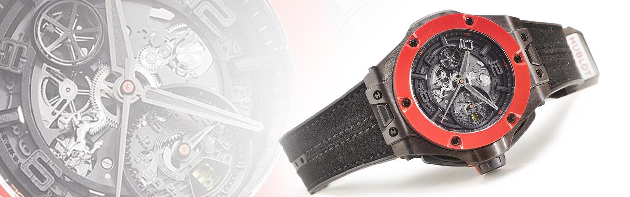 品牌如此作法,除了考慮到碳纖維的輕量、高硬度、防腐蝕、低過敏等特質外,另一涉及設計面的考量,則是這樣能讓視覺焦點聚焦在所採用,同樣輕量、高硬,抗過敏、防腐蝕的紅色陶瓷錶圈上。紅色陶瓷向來被視為比較難製作的顏色,主要在於成色難以保持一至。近期雖然已經有品牌推出紅陶瓷錶圈,但製作成這麼厚實的似乎還是只有宇舶一家。宇舶打破過往陶瓷高溫燒結,改採相對低溫高壓的做法有效控制成色,其材質魔術師的稱號絕非浪得虛名。貫徹Big Bang Ferrari系列特色,包括定位錶冠、快拆錶耳,並融入諸多法拉利跑車元素。內裝HUB 1241Unico自動上鍊機芯,也是此一系列常用的飛返計時機芯。限量500只。