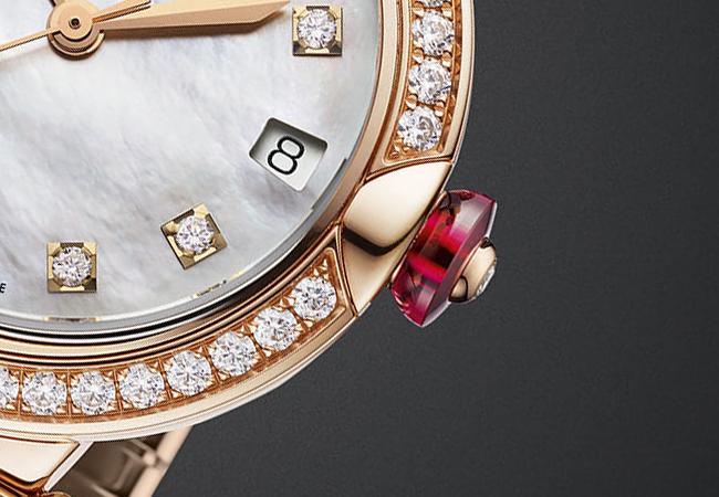 這是Lvcea Tubogas錶款同時融入腕錶時計與珠寶飾品的證明。寶格麗也希望透過這樣的作品,將珠寶所代表的奢華品味融入日常,為佩戴者帶來全新的風格。Lvcea Tubogas提供多種不同材質、款式選擇,有不鏽鋼、貴金屬、單純鑲鑽,奢華滿鑽等不同選擇,以滿足不同喜好的消費者。此款直徑33mm,玫瑰金錶殼,珍珠母貝面盤,鑲鑽錶圈,錶耳與錶帶接合處,也巧思獨運地鑲嵌一排鑽石。錶冠則鑲嵌一枚蛋面切割的粉紅寶石與鑽石。呈現大家閨秀,溫雅內斂,但又光芒奪目的情調。自動上鍊機芯,瑞士製造,義大利設計,在各項不外顯的工藝之處同樣堅持,寶格麗並不因為是女錶而稍有妥協。