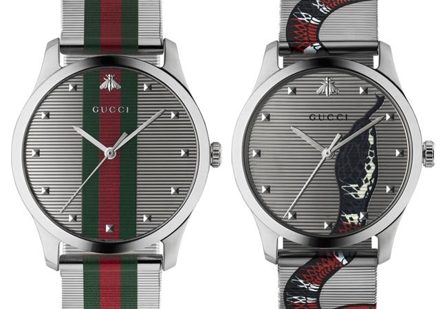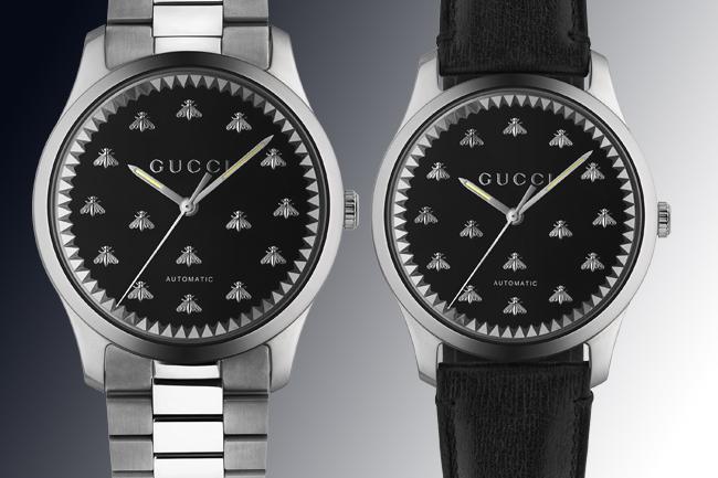 Gucci推出八款耀眼新作,揭示G-Timeless自動腕錶系列新方向。每一款新腕錶皆採用寶石錶面並裝飾代表Gucci品牌標誌的蜜蜂圖案。特別是可調式錶扣以精緻的雙G標誌造型,透明後底蓋讓自動上鍊機芯一覽無遺。三款38毫米腕錶以18K黃金錶殼搭配黑瑪瑙石錶面和黑色鱷魚皮錶帶、咖啡色虎眼石錶面和咖啡色蜥蜴皮錶帶,或綠色孔雀石錶面和飾有印花圖案的珍稀皮革錶帶。錶帶採可替換式設計,為個性化風格創造無限可能性。