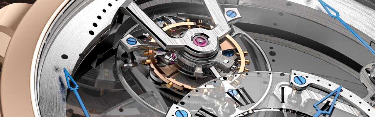 經鏤通的A&S8615機芯鮮明獨特地將時、分、秒分別置於不同軸上,藉此向約翰・阿諾(John Arnold)的標準鐘(regulators)致敬。機芯採用三層式結構,顯示小時的藍寶石水晶小錶盤疊在陀飛輪與兩個動力儲備顯示之上,鍍銠的分鐘環則置於頂層。這獨一無二的結構為腕錶帶來了充滿動感和層次的面貌。為進一步加強平衡和對稱感,更特別將錶冠設於六時位。