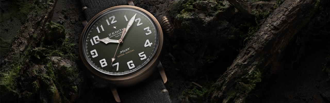 搭載易調節寬大棘輪錶冠,成為早期航空儀器演變為21世紀的配備靈感,,Pilot Type 20 Adventure採用45毫米青銅錶殼,鈦金屬錶殼底蓋上裝飾有ZENITH真力時飛行儀錶的標誌,作為向它們敢為天下先的開拓精神致敬,這些都市的配備採用粒面卡其綠色錶盤,及由Super-LumiNova®螢光塗料製成的超大阿拉伯數字時標。具有冒險精神迷彩鱷魚皮和柔和的卡其色矩陣小牛皮皮帶可供選擇,兩者都帶有保護性橡膠襯裡和鈦金屬扣針錶扣設計,增加搭配及實用性,進而讓Pilot Type 20 Adventurer成為終極配飾。