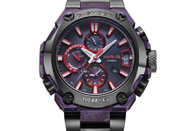 MRG-G2000GA傳達了對細節上的專注與細緻,錶殼以再結晶鈦製成,其閃亮的外觀喚起日本劍鋒由晶體形成的波浪刃紋,並以日本貴族的深紫色 (Koki-murasaki) 電弧離子鍍(AIP®)*1處理。錶圈則由COBARIAN®*2製成,以日本刀劍尖的靈感為來源。MRG-G2000GA採用三重接收訊號系統,透過接收六局電波電訊、GPS衛星訊號和藍牙進行時間調整,以確保準確顯示全球時區和夏令時間。MRG-G2000GA將創新技術與日本美學融為一體。