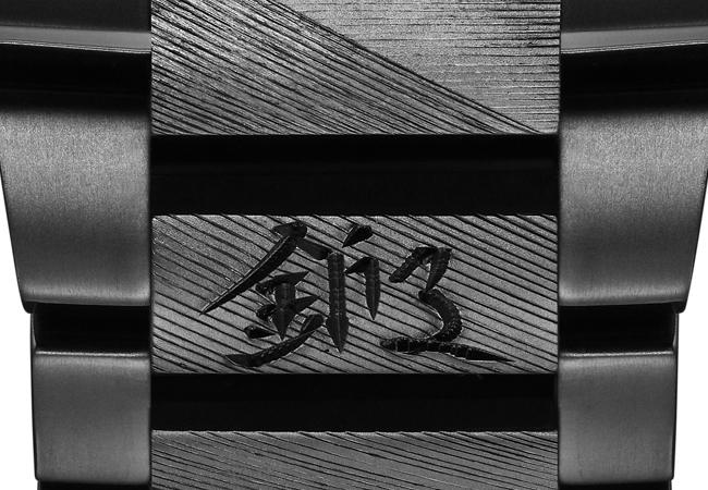 MRG-G2000GA的錶帶的中心部分採用了著名的月山劍士傳統的標記圖案,這標記圖案由月山 貞伸 (Sadanobu Gassan) 以手工精心製作每一節,同時亦承傳著擁有800年歷史的月山 (Gassan) 傳統。錶圈下方的第二節刻有漢字「鍛」,來自月山傳統所信奉的「鍛刀一筋」,意涵對鍛造工藝的奉獻 (tanto hitosuji)。