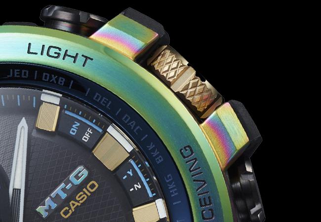 卡西歐為紀念MT-G系列邁入20週年發佈以鮮豔的彩虹離子鍍層錶圈的MTG-B1000RB