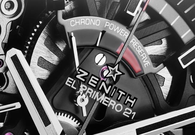 時針、分針和連續小秒針,以及鑲貼時標,均為黑色鍍釕刻面,並加入黑色SuperLuminova螢光塗料,在黑暗中也能發出細微的光芒。1/100中央秒針、秒針和分針計時器彰顯其無與倫比的高速計時功能,黑色錶針頂端均塗成亮紅色,其外觀體現了ZENITH真力時的新未來主義結構設計風格,為追求風格的鐘錶愛好者創造出不凡的時計。