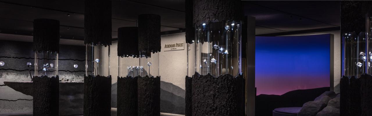 從汝拉山谷開採的礦物被重新打造為牆壁、陳列櫃和家具。在會客廳的中央位置,以沙和矽石模塑而成的雲杉森林則展示了最新愛彼Code 11.59系列腕錶,以及一系列別出心裁且具有非凡造型和設計的精選歷史名錶。而在製錶師工作檯後方的分層牆不但展現汝拉山谷Combe Noire採石場的結構,更蘊含了愛彼最新腕錶系列的五大元素:金、黃銅、砂金石、藍寶石水晶玻璃及鐵,讓人聯想到愛彼於發源地的歷史與高級製錶的非凡工藝。