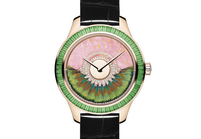 DIOR GRAND BAL SUPERNATURAL系列腕錶的設計宛如奇趣魔幻的生物一般,融合令人驚艷的珍稀天然材質精心打造。自動盤飾以充滿原始風情的羽毛,蛋白石錶盤的光彩,因錶圈鑲嵌的梯形切割彩色寶石而加倍綻放。錶底蓋則以蝴蝶翅膀妝點,完美了錶面上的瑰麗故事,在此,時計幻化蛻變成為超自然的美麗生物。Dior Grand Bal Supernatural搭載品牌專屬 “Dior Inversé 11 1/2”自動上鏈機芯,機芯和錶盤功能性擺陀的規律節奏,展現舞會禮服裙擺的飛舞迴旋。此一系列錶款結合Dior高級訂製服的羽毛製作工藝與傑出製錶技術,宛如綴滿鑽石的華美襯裙,可謂腕間之極致工藝傑作。