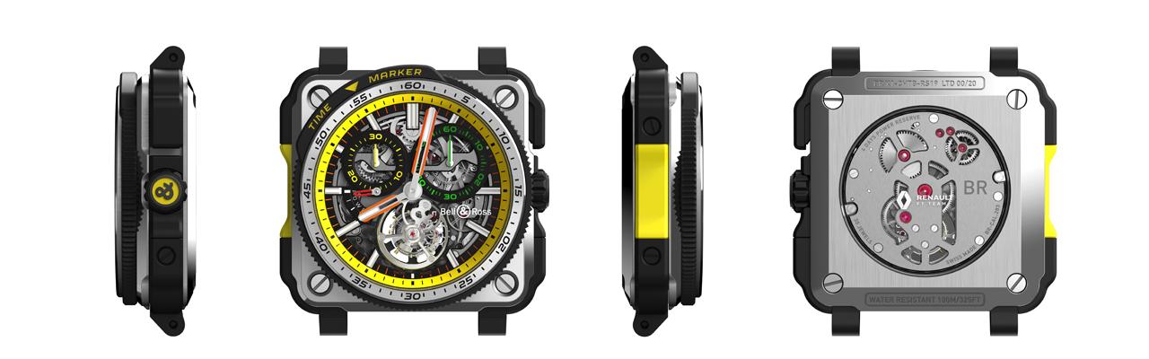 全新R.S.19系列包括四款具有超凡卓越性能的全新駕駛計時碼表 :BR03-94 R.S.19,BRV3-94 R.S.19, BR-X1計時碼表R.S.19以及BR-X1陀飛輪計時碼表R.S.19。這一次,整個系列在雷諾F1®車隊代表性的黃、黑顏色基礎上,增加了以駕駛艙按鈕為靈感的綠、紅、橙色,在材質上,RS19的錶盤採用了一種F1®賽車必用的基本高科技材質:碳纖維。在設計上,四款計時碼表的所有功能設計完全以駕駛過程中的易操作性為考量標準:BR03-94 RS19和BRV3-94 RS19都配備雙向計時表圈,符合人體工學的凹槽式設計方便使用者在佩戴手套的情況下操作,另具備精準度可達八分之一秒、跨時長30分鐘的高精密秒錶功能。今年BR-X1計時碼表的新增設計是錶盤周圍的表圈上添加了“時間標記”,可標記出黃色運行秒針停的位置並可連續標記不同的時刻。 5級鈦金屬、陶瓷及橡膠材質的混合運用成就了本款腕錶的超輕重量。 BR-X1陀飛輪計時碼表融合了BR-X1精簡風格,表圈設有全新分圈時間標記,並配備停秒計時碼表功能。