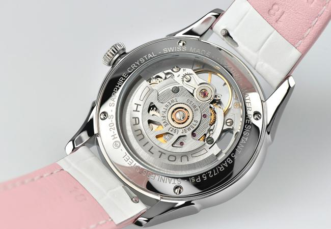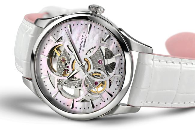 爵士大師芯動系列,面盤透過運鏡角度的焦點變化,綻放「正看成花 側看成蝶」的迷人視覺魅力,芯動系列自推出以來,一直備受都會女性與淑女名伶青睞,順應消費者對於浪漫腕錶的靈感渴望,漢米爾頓設計師,將女性視為珍寶的珍珠母貝面盤,揉合夢幻的粉紅色彩,激放青春甜蜜的活力氣息。錶款運用粉色襯底滾邊的白色真皮鱷魚紋錶帶,襯托粉紅芯動系列,令配戴者舉手投足間,揮灑迷人自信的都會浪漫。