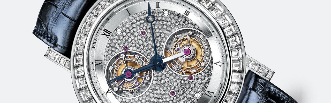 這款寶璣獨步錶壇的非凡傑作,鑲鑽版本面世展現高級鐘錶珠寶鑲嵌技術。仔細欣賞錶面,兩枚60秒陀飛輪以搭載差動齒輪的特殊機制連結彼此,使得雙陀飛輪在交互作用下,更加有效抵消地心引力對走時的影響,讓腕錶愈加精準;此外,雙旋轉陀飛輪在面盤上每12小時運行一圈,其中一枚代表時針,分針則獨立運作。整體看來,雙陀飛輪如天體運行一般公轉自轉的設計,彷彿將外太空視野微縮於面盤。翻開錶背,以手工鐫刻的太陽系九大行星浮雕映入眼簾,巧妙呼應雙陀飛輪運轉姿態,由內而外的頂尖創意與工藝美學,令人一見傾心。