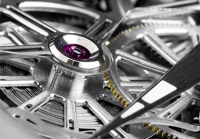 此外,AP擒縱還搭配了180度偏移的雙游絲,在擺輪上方可以看到明顯的兩個游絲樁,這是絕大多數機芯看不到的風景。雙游絲的搭配可以相互補償,當腕錶處於各種不同方位時,都能維持一致的精準度。這也是RM 031能達到超高精準的原因之一。