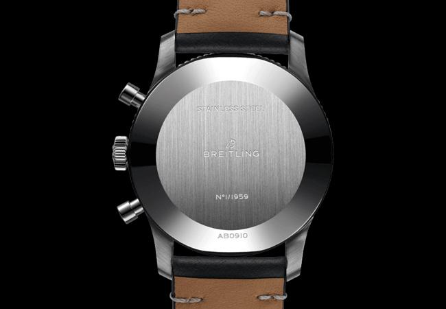 機芯搭載的是全新的型號B09,型號雖新但基本上就是B01的手上鍊版。很難相信B01問世十年從未出過「單純」的手上鍊版,目前的手上鍊型號除了上鍊機制之外都還追加了其他修改,比如說B02的時分針改成了24小時制,B14則是兩眼單按把(也就這兩種了),純粹的手上鍊版B09應該是首次出現——在我的記憶角落總覺得他們好像出過日本限定的手上鍊版,不過找了半天找不到也只能放棄了。少了自動盤厚度也薄了點,標準的Navitimer 43mm厚度是15.4mm,806復刻版只有12.86,比Cosmonaute的13.3又薄了一點,儘管同樣是手上鍊;這裡可以做得更薄搞不好跟押入式底蓋也有關,Cosmonaute是旋入式的,蓋身上多了一層多角圈用來咬開蓋器,押入式的沒有這層的確是可以更薄一點。話說關於實底蓋這個選擇,本來百年靈就很少用透明底蓋,原本也沒什麼好可惜的,然而Georges Kern接掌以後大幅地在自製機芯款式中啟用透明底蓋,改變了長久以來的現狀,只是這次這款打的就是一個忠實復刻,所以儘管裝的是少見的手上鍊機芯錶背還是封了起來,也算是有所不為了。