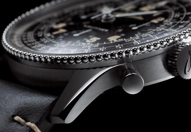 再來就是這次復刻最大賣點的錶圈和錶面了。去年Navitimer 01推出38mm三針款的時候我就曾經對它恢復了珠珠式的止滑錶圈一提再提,不過除了少數玩家之外好像沒什麼人有共鳴,這次挑明了復刻的名義再度使用這項元素大家就不得不注意了。環錶圈一周總共有94顆珠子,據說在1950年代一度多達125顆,到了1960年代又減為93顆。其實相較於現行的鋸齒圈我並沒有特別偏愛珠珠圈,鋸齒圈好用好看作工又細向來是我大加讚賞的,這裡對珠珠圈的興趣單純出自對原始設計的好奇,兩種之間無所謂優劣好惡。為了復古錶鏡採用了壓克力材質;事實上現在藍寶石水晶什麼形狀都磨得出來了,硬要用壓克力除了可以省錢跟拿來說嘴之外我認為沒什麼實質意義,百年靈做東西自然不會貪那一點成本,這裡不用藍寶石水晶大概只是為了一個象徵性了。