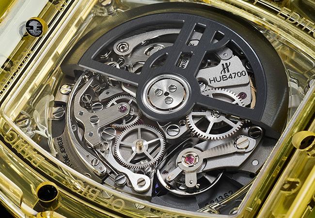 錶款內裝HUB 4700自動上鍊機芯,每小時36,000轉的高振頻,動力儲存50小時。雖然基礎結構是枚圓形機芯,品牌在殼內加上一層酒桶型框架,使錶殼與機芯更為合襯飽滿。黑色的機芯與輕透帶些俏皮的黃色透明錶殼,反而激盪出充滿活力的感覺。如果以人來比喻,這錶好像很適合李小龍。