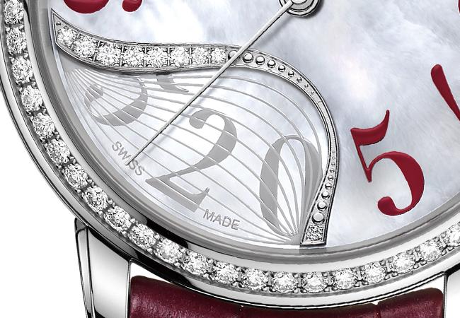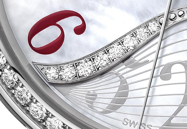 面盤上依舊有著柔美的波紋曲線,此處由6點延伸到9點,結合曲線到錶殼邊緣這段區域的條紋霧面設計,打造出唯美的葉形輪廓,為整體帶來貼合女性氣質的典雅感。而此錶相當獨特的是,其將8、7、6三個時標分別改為5、2、0,乃是取漢語「我愛你」三字諧音而來,這如同設置暗語般的告白文字隱晦而親密,由左而右排序也符合行文習慣。