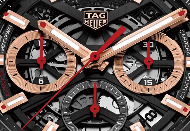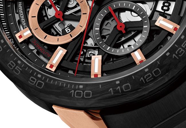 此錶以鍛造碳帶來的這些優點,結合系列融於血脈的賽車基因,展現濃厚運動氣息。其搭載Calibre Heuer 02自動機芯,雙眼計時規格,具80小時動儲。面盤以黑面為底與鍛造碳錶圈色感相襯,其上包括雙眼計時圈、時分針、時標均以鍍玫瑰金裝飾,十分亮眼。
