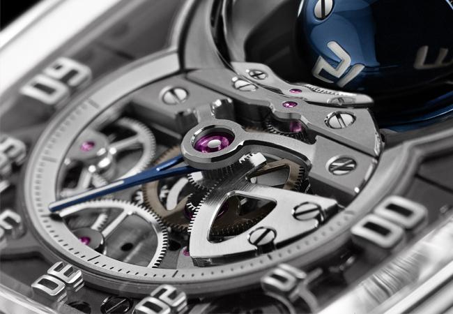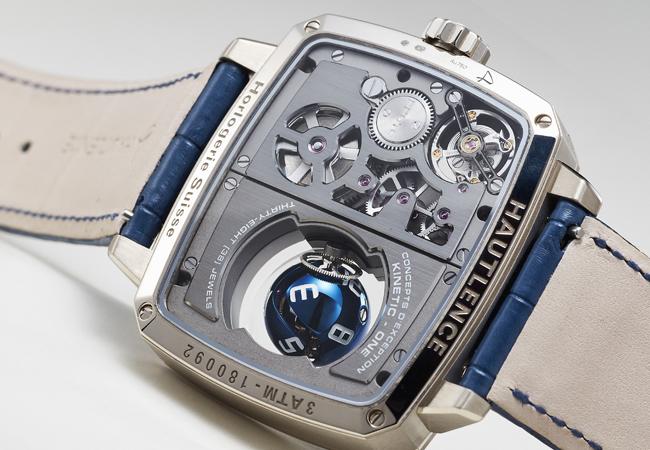 豪朗時花了五年的時間,研發出前無古人的球體小時顯示,利用亨利慕時H.MOSER & Cie.的HMC 200機芯做為基礎,開發出該枚Kinetic One手動上鍊機芯,在機芯左半邊,透過球體的旋轉方式來顯示小時,不過這個以鈦合金材質製作、上面以雷射刻有小時數字並填入白漆的藍色球體,並不是真正的完整的一顆球,而是用S型切割成兩半,一左一右的各自附著在機芯左半邊一個傾斜21度的三軸機械結構上,所以旋轉時可發現它其實是循著這個S軌道在旋轉,透過右半邊逆跳分鐘運作時累積的動力,就能提供左半邊球體小時顯示一次旋轉450度所需要的動力。