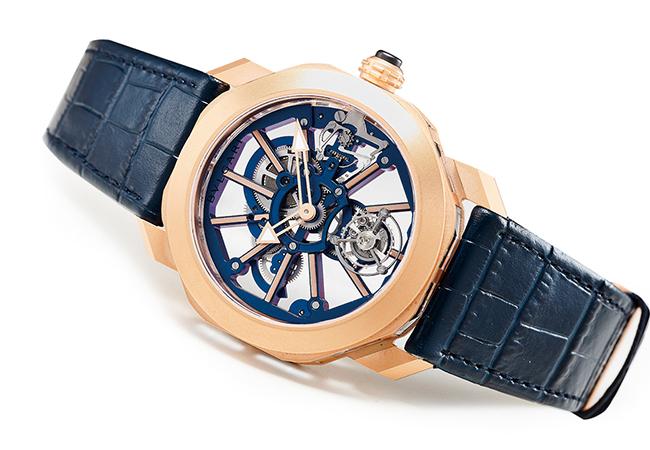 Octo Roma水晶陀飛輪腕錶在今年加入玫瑰金錶殼,搭配湛藍色夾板,視感典雅清爽,面盤上大面積的鏤空設計令飛行陀飛輪呈現漂浮般的通透視覺。44mm/18K玫瑰金與藍寶石水晶/參考價約NTD 2,810,000