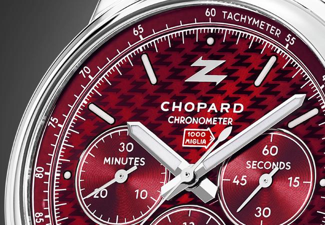 基於此性能卓越的計時機芯,蕭邦和Zagato設計出一款高貴典雅的腕錶,細節精心考究,令時計盡顯優雅風格。首先,錶盤飾有米蘭設計商Zagato和Mille Miglia千里賽鍾愛的紅色漆面Zagato首字母「Z」形圖案。12時位置設有兩個品牌的標誌,彰顯這款腕錶的淵源,周圍環繞覆有SuperLuminova超級夜光物料的巴頓式時標和指針,確保在任何環境下皆清晰可讀。黑色鋁製內環鐫刻測速計刻度,突顯此計時碼錶的運動氣質。此車賽必備配飾可計算比賽期間的平均速度,Zagato充分利用其功能,在24次參賽經歷中,八次榮膺Mille Miglia千里賽冠軍,開創紀錄!