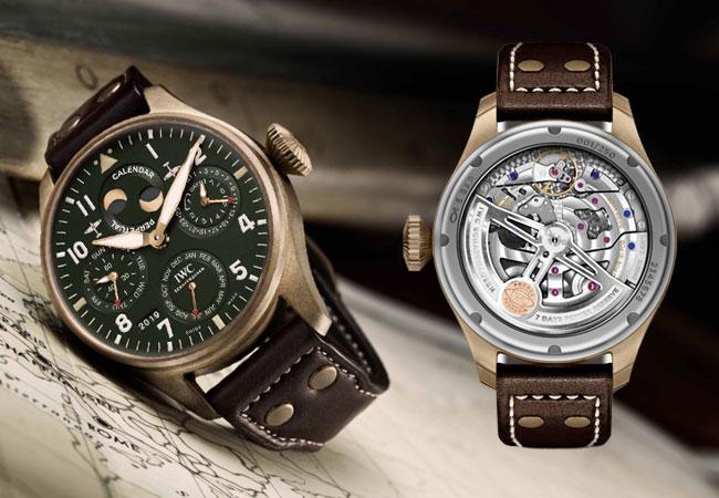 最後還要介紹能顯示南、北月相的噴火戰機大型飛行員萬年曆腕錶,這款雖然不是使用新機芯,但換上青銅錶殼與綠色面盤後,是不是很有思古之幽情?