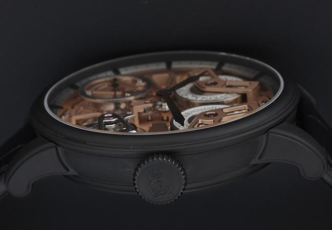 此錶錶徑為46mm,尺寸上算相當大,寬大的面盤空間足夠安放整個如微型建築般的面盤結構。其錶殼則以噴砂黑灰色DLC塗層的沉穩、細膩質感與亮色系的精彩面盤做對比。細細觀賞錶殼側面,也有乾坤藏於其中。許多品牌打造的錶殼側邊是設計為整齊的垂直線條,而亞諾錶在此處做了別樣的發揮。從側面觀看可發現其線條略有弧度,上下各有層次呈現獨特的雙階式錶圈。這在生產、製作上較為複雜,成本也較高,但呈現的美感卻十分獨特,亞諾錶以呈現最佳效果為優先考量,其製錶的堅持由此體現。