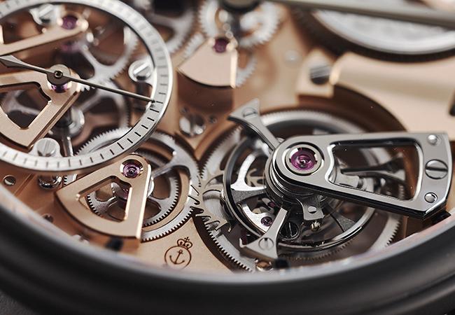 精緻的工藝展現也是這款腕錶的一大看點。A&S8600以不鏽鋼和鎳銀製成,鍍5N紅金打造夾板和基板並經噴砂處理。其上所有零件均為手工修飾,在為數頗多的各處邊角上,可見細緻的倒角打磨、拋光,搭配齒輪、指針上的拉絲處理和雙發條盒上以雷射雕刻的文字,十分精巧用心。