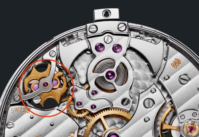 江詩丹頓研發的這個裝置由兩個顫音塊或砝碼組成,用作調速器旋轉桿的制動器,從而平衡發條盒游絲所釋放的能量。為實現這一功能,制動器借助了離心力和向心力的作用。當調速器轉動時,離心力以顫音塊的其中一端為中心向外,而另一端壓在旋轉桿上,從而使旋轉速度更加穩定。除此之外,本款調速器的細微之處都經過悉心打磨修飾,零件的背面還鐫刻有江詩丹頓的品牌標誌馬爾他十字徽號,即使這個圖案無法從機芯正面看到。