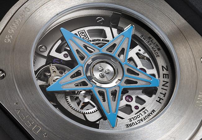 本錶款所搭載的Elite 670鏤空自動機芯,是真力時專為Defy Classic自動腕錶系列所打造的新款機芯。過去Elite 670機芯是品牌最常使用的一款大三針日期機芯(Elite 680則是小三針日期機芯),但是為了新一代Defy系列錶款採用鏤空設計,廠方重新打造鏤空版本的Elite 670機芯。前後兩代的機芯,除了背面夾板大量採用鏤空設計之外,鏤空版的Elite 670機芯機芯厚度也增加至3.88mm(主要是自動盤變厚)。