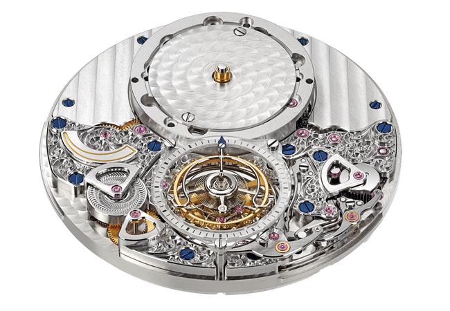 42毫米鉑金錶殼透露出精心裝飾的機芯。偏心式電鍍藍色錶盤下方,可看見以多層結構及飾面組成的迷人美景。錶盤和飛行陀飛輪像小塔般從機芯的上半部和下半部立起,創造出引人注目的3D立體效果。開放式設計與部分透明的藍寶石水晶秒鐘刻度環將人們的目光吸引到腕錶深處。各種手工鐫刻及經典的格拉蘇蒂條紋飾面讓表面裝飾更添完美。