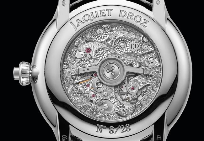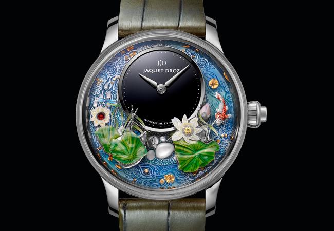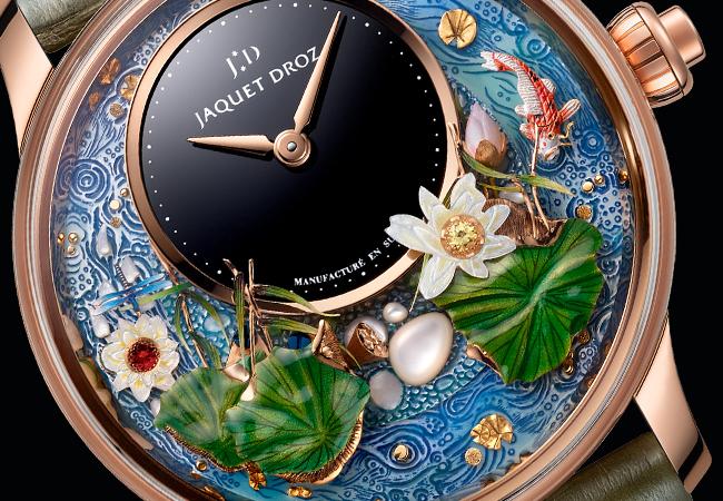 錦鯉幻蓮(Magic Lotus Automaton)腕錶直徑為43毫米,備有紅金或白金款式,各限量發行28枚。錶背一面、錶橋和擺陀飾以人手雕刻的獨特自然主義圖案,尤其雕飾錦鯉和蓮花,與錶盤圖案相映成趣。未經雕刻的機芯零件亦悉心裝飾(例如圓紋打磨、拉伸等)及經手工倒角處理。這款全新自動玩偶腕錶已提交四項專利申請,擁有雅克德羅(Jaquet Droz)有史以來最精緻考究的錶盤。機芯包含500多枚零件,研發耗時超過三年。