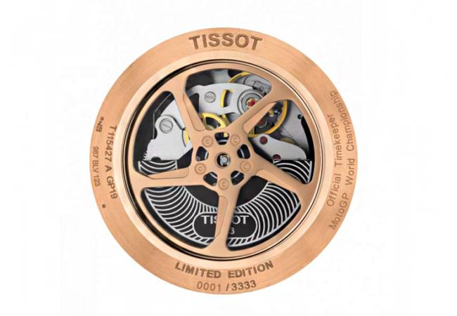 天梭表TISSOT T-Race MotoGPTM 2019自動腕錶採用特別設計,配備以碳纖維製作的黑色圈環。碳纖維是一種堅固的物料,極其耐久,讓人想起電單車上堅固的組件。出色的技術成就並蘊藏於這款腕錶的核心之中,而腕錶更配備呈車輪狀的透明底蓋,讓人可輕易欣賞當中的機芯運作。