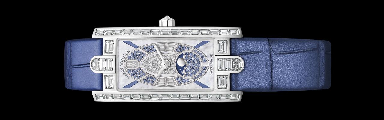 1949年,溫斯頓先生收購了世界上現存最大的一顆藍色鑽石,長期以來,藍色一直是本品牌的核心色調。海瑞溫斯頓的製錶大師採用精湛的手繪工藝,在珍珠母貝錶盤上重現雙藍色調的漸變設計,陽光像是從錶盤頂部品牌標識中四射而出,在接近錶盤邊緣時逐漸擴散開來。深藍和淺藍色光線的漸變對比,為錦簇鑲嵌鑽石的錶盤,勾勒出一幅令人嘆絕的精緻美景。