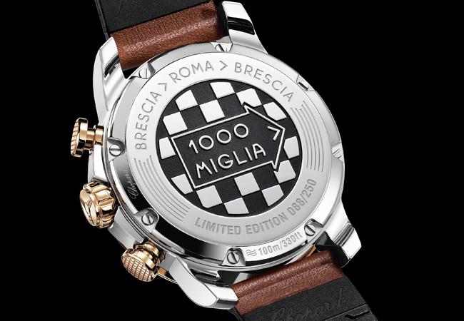 Mille Miglia 2019 Race Edition腕錶是一款專為車賽而生,比擬賽車的腕錶傑作。堅固耐用的44毫米錶殼採用旋入式底蓋,防水深度達100米。底蓋上鐫刻Mille Miglia車賽標誌,黑色PVD處理方格圖案令人想起比賽旗幟,搭載獲瑞士官方天文台精密時計認證(COSC)的自動上鏈計時機芯,動力儲存達兩日。其震動頻率為每小時28,800次,能夠測量1/8秒的時間,可謂古董賽車在道路上的絕佳夥伴。對於參賽選手而言,錶圈黑色鋁製內環上的測速計刻度能夠幫助他們計算比賽期間的平均速度常重要,因為保持穩定的節奏是Mille Miglia耐力賽中的關鍵因素。