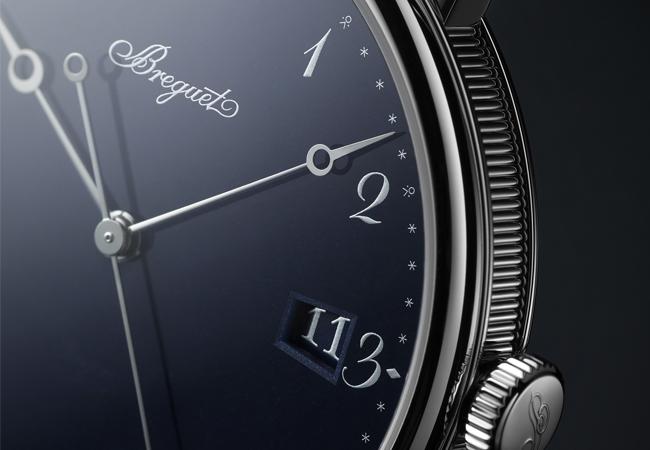 表盤色調呼應寶璣指針經過處理後形成的藍色。為保證色澤於製作期間絲毫不差,品牌必須詳盡研究,才可開發顏料。物料的顏色必須在攝氏800度以上的燒製過程中保持完全穩定,方可製成擁有獨特紋理的「大明火」琺瑯。具有月亮形尖端的鍍銠精鋼指針在藍色背景上格外突出,確保時間清晰易讀。刻度圈綴以尺寸較大的鍍銀阿拉伯數字、星形、菱形及鳶尾花形裝飾,同樣為保證時間易讀的設計。這些浮雕裝飾則源於精緻典雅的色粉描摹技法。由於日期顯示窗設於深色的下層視窗,其上的數字亦以相同的工序處理,使之更為顯眼。最後,琺瑯材質的寶璣簽名隱蔽呈現於6時位置。寶璣一直為所有配備琺瑯表盤的時計飾以亞伯拉罕-路易·寶璣先生書法字體,例如1787年推出的寶璣15號自動上鍊懷表。