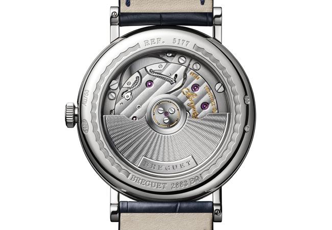Classique 5177「大明火」藍色琺瑯腕表由自動上鍊777Q型機械機芯驅動,功能簡單實用,包括中央秒針,以及設於3時位置的日期顯示。品牌運用先進技術,如矽質槓桿和擒縱輪,使精密計時性能更加可靠。另一方面,機芯的部分美學元素皆與十八世紀末的寶璣作品相似,尤其是齒輪的形狀。自動上鍊機芯特有的擺陀以18K金製作,經過手工鐫刻,可透過藍寶石水晶表背底蓋欣賞其美態。同樣,每件零件不論是否清晰可見,均須經過寶璣工匠大師的精心修飾,展現倒角加工、圓紋打磨、磨砂或日內瓦波紋工藝。