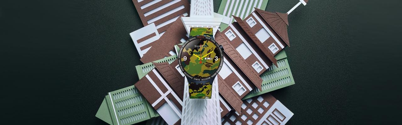 六款腕表均繪製有 BAPE全新設計的招牌迷彩圖案,時針和下錶帶均飾有 BAPE的猿人頭品牌標誌,而醒目加粗的SWATCH標誌則讓人聯想起SWATCH於上世紀 80 年代的首次震撼亮相。其中五款腕表以城市伯恩、倫敦、紐約、巴黎、東京為主題,帶有獨立編號,限量發售 983 枚或 1993 枚,以此紀念兩個品牌各自的誕生年份,而第六款 BIG BOLD BAPE The World 則以世界為主題,向全球致敬。這一系列所有腕表都彰顯出獨特的性格魅力,立刻掀起全球潮人及錶界玩家高度關注及預購熱潮,強勢撼動時尚圈,橫行街頭引爆潮流話題。