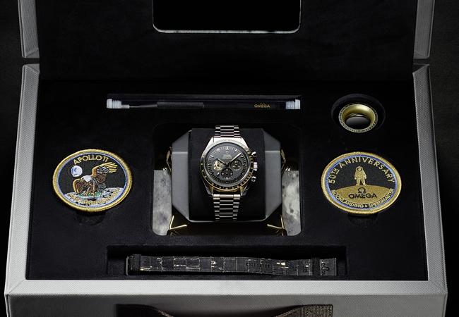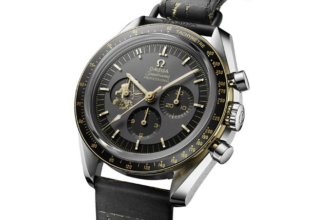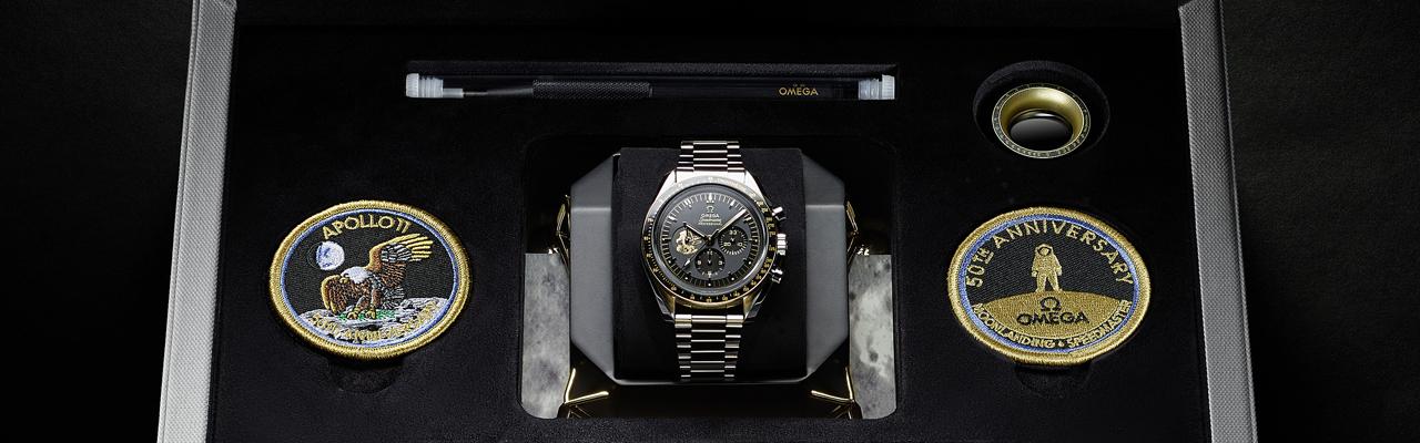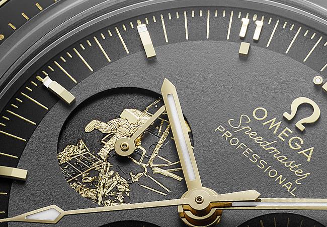 巴茲‧艾德林(Buzz Aldrin)在世界協調時間(UTC)03:15:16從小鷹號爬下抵達月球表面時,他戴著一只歐米茄超霸腕錶。在那個時刻,他的腕錶成為第一只登上月球的腕錶。在全新限量版腕錶的9點鐘計盤,歐米茄在一片Moonshine金雷射鐫刻巴茲踏上月球的圖案。有別於所有其他時標,11點鐘時標是以18K Moonshine金構成的數字11,藉此向該次阿波羅任務致敬。