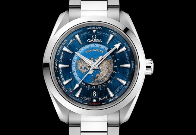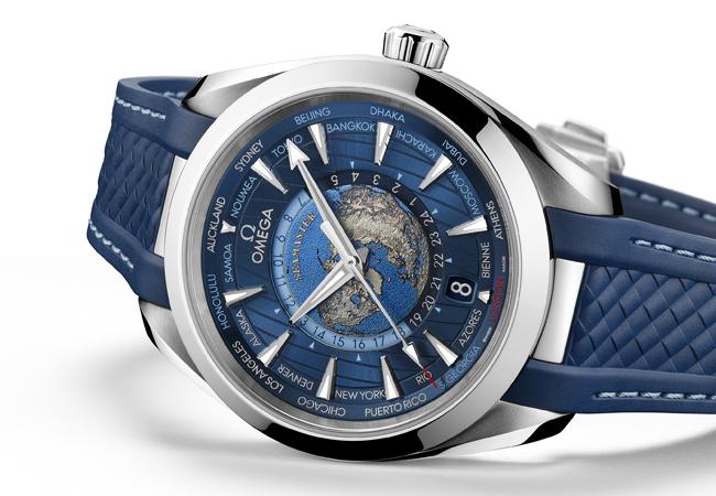 太陽紋磨砂藍色錶盤擁有Aqua Terra的垂直甲板條紋以及全新內環。錶盤環繞一圈環球城市,其中包括特別設計的歐米茄總部所在地瑞士比爾(GMT+1)。