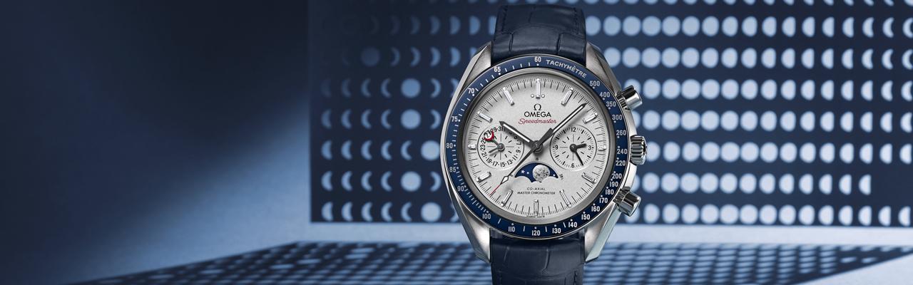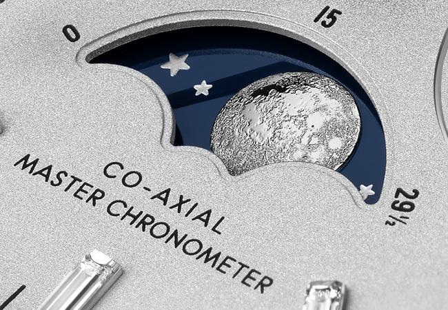 為精準追蹤月相盈虧,歐米茄利用兩顆鉑金液態金屬打造而成的月球,創造了一個藍色陶瓷月相盤。
