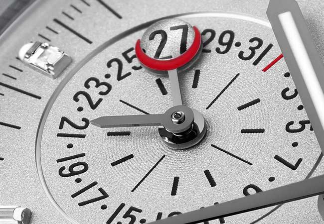 鉑金(Pt950Au20)的使用讓這款月相腕錶卓然出眾。此種材質被用於磨砂與拋光44.25毫米錶殼,以及噴砂錶盤和藍色皮革錶帶的錶扣。