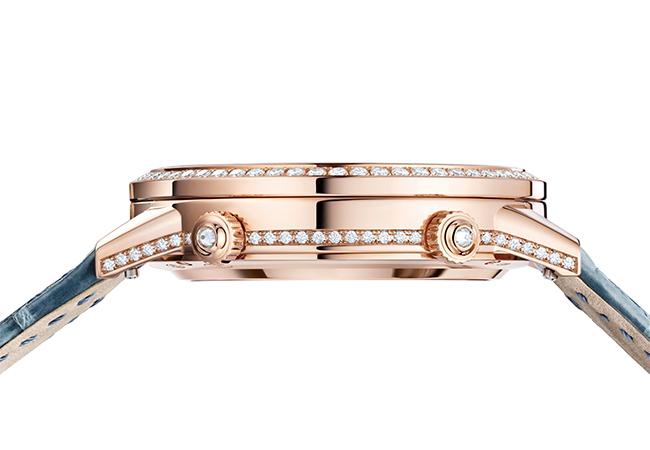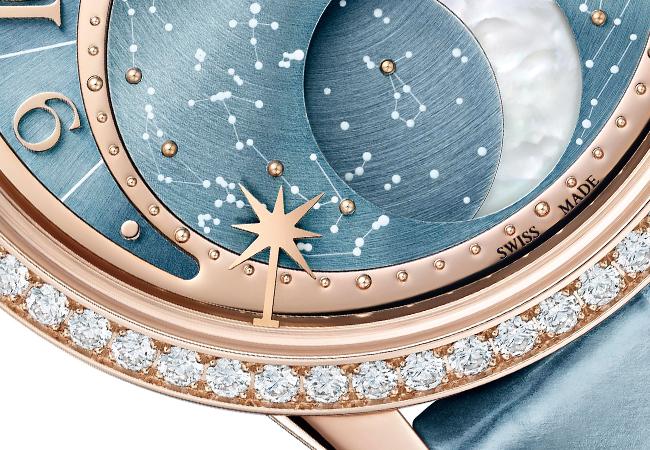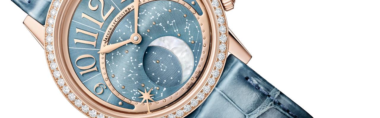 積家JAEGER-LECOULTRE今年在Rendez-Vous約會系列加入了不同的用色、月相設計,甚至在爪鑲工法、鑽石克拉數上都有所升級。在數只新款中這只青藍面配以星空圖款式尤為唯美。面盤承襲舊有三層式設計,6點為大面積月相顯示,使用珍珠母貝材質,柔美光澤散發出溫潤質感。