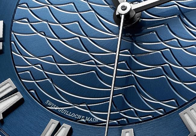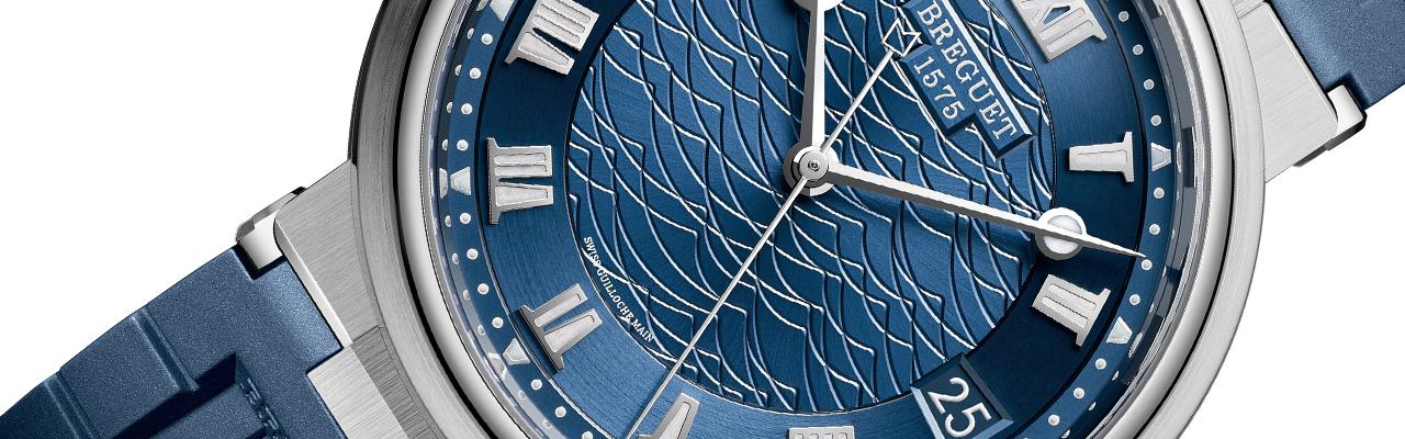 寶璣BREGUET的Marine系列在去年回歸基本實用,鈦材質的導入甚至降低入手門檻,但若是喜歡5587那樣的波浪雕刻紋面盤,還是只有貴金屬的版本可選。在同時推出的數只錶款中這只大三針日期功能最為簡單,面盤中央大範圍的波浪雕刻紋在湛藍的色彩搭配下,呼應系列海洋性格。