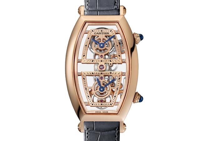 值得注意的是,鉑金材質在款式推出的那個年代算是少見,卡地亞當時就曾使用鉑金材質來製造這款錶了,與酒桶形造型同樣是當時的前衛之選。此錶內裝1917 MC手動上鍊機芯,具備約38小時動能。由於近幾年卡地亞稍緩高複雜製錶的腳步,不免讓人期待能夠看見眼前一亮的複雜新作,此系列推出的另一款式鏤空雙時區腕錶就帶來不少驚喜。過去在製錶師與設計師間的抗衡下,在復雜錶款上往往是製錶師的個人意志較為偏重,設計師的設計語言很多時候需要妥協。但此錶款倒是不同,為了服膺經典的Tonneau酒桶形錶殼,機芯在內部做了改造。